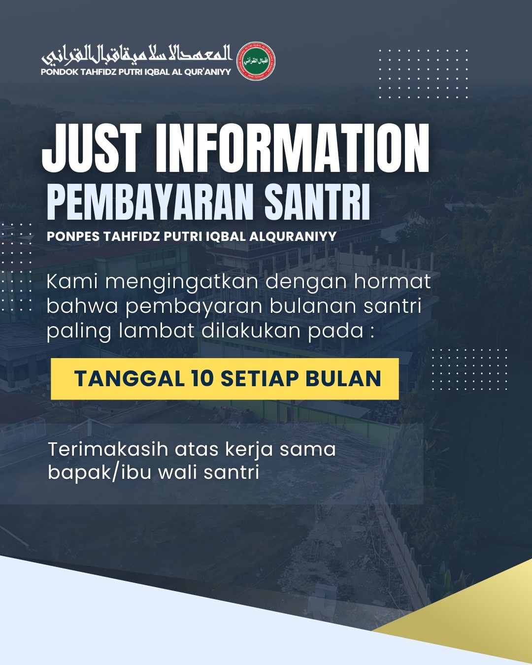 <p>Yth. Wali Santri</p><p>Kami mengingatkan dengan hormat bahwa pembayaran bulanan santri paling lambat dilakukan tanggal<strong><u> 10 setiap bulannya.</u></strong></p><p>Terimakasih atas kerjasama Bapak/Ibu Wali Santri.</p>